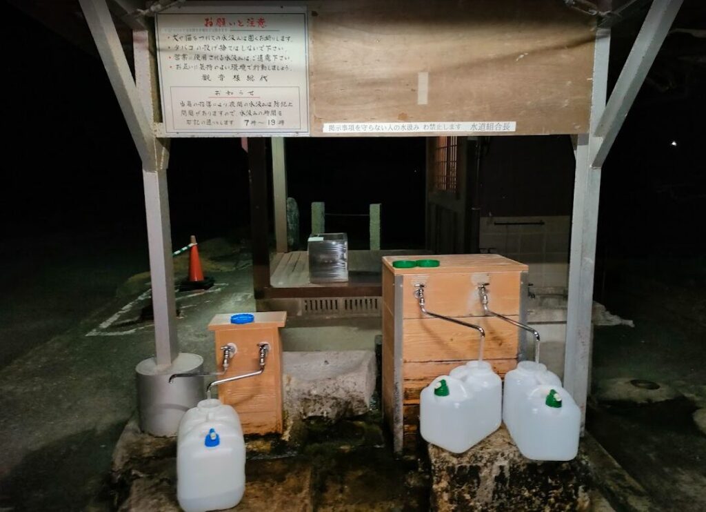 今回は到着したのは18時過ぎでしたが外は真っ暗、水汲み場は田畑の真ん中に